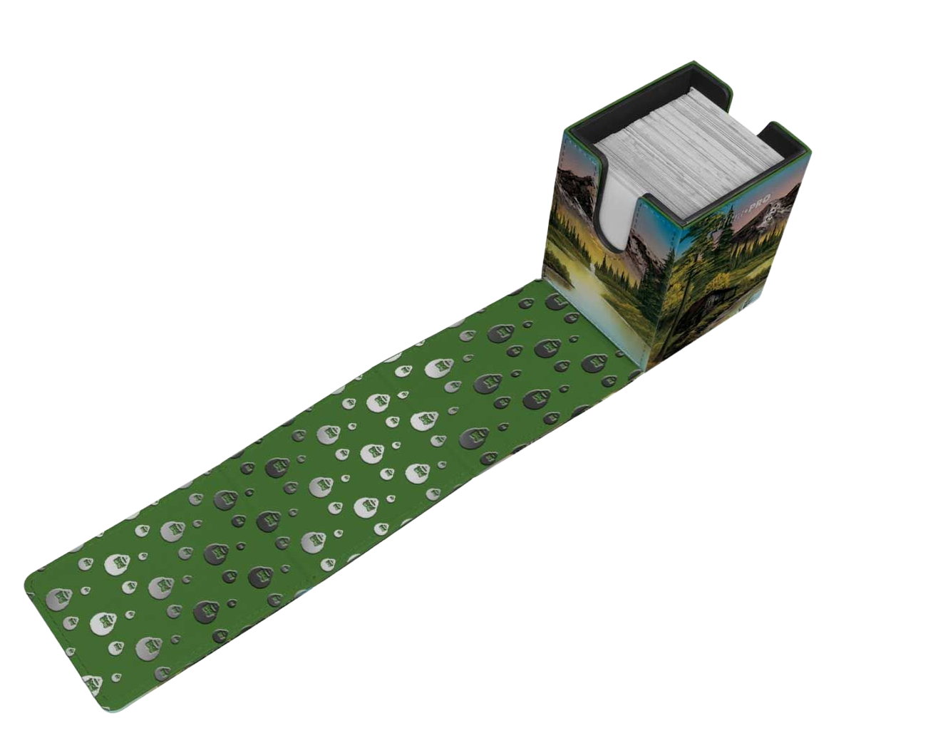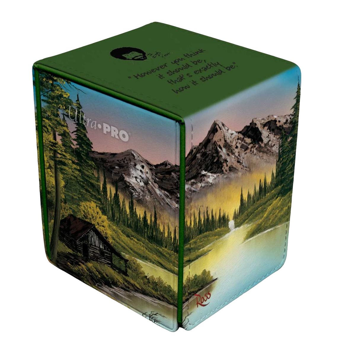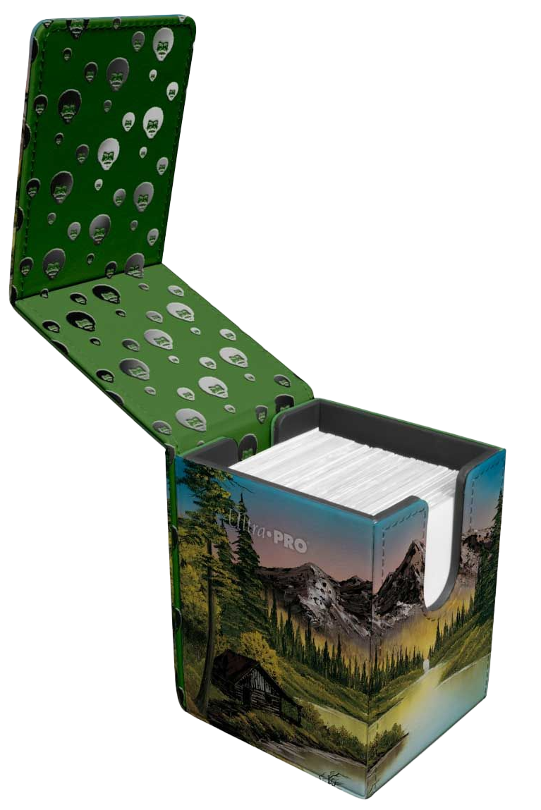 The Mountain Retreat Alcove Flip Deck Box features a Bob Ross original painting of a wooded mountain scene at sunrise with a cozy cabin on a leatherette finish, so you can keep the joy of nature (and your TCG deck!) with you wherever you go. A strong magnetic closure keeps your cards happily secured inside, and dual thumb notches offer easy access to your deck. This Deck Box® holds up to 100+ standard size trading cards double-sleeved in Ultra PRO Deck Protector® sleeves.