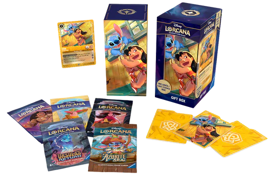 This Disney Lorcana Gift Box includes a unique foil card featuring brand-new Lilo art and comes with an assortment of Booster Packs containing 60 cards from different Disney Lorcana TCG sets. Everything is inside an illustrated storage box to keep up to 250 sleeved cards safe.