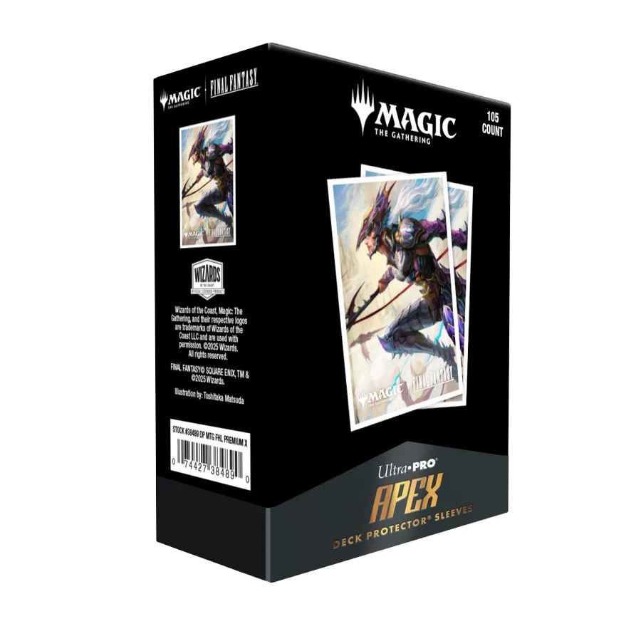 The MAGIC: THE GATHERING®—FINAL FANTASY™ 105ct APEX Deck Protector™ Sleeves are made with our new easy-shuffle formulation and feature vibrant artwork on a textured back. Archival-safe polypropylene materials ensure you can sleeve your cards with confidence, and the gloss clear front allows your foil cards to shine! Sized for standard size trading cards measuring 2.5 in. x 3.5 in.