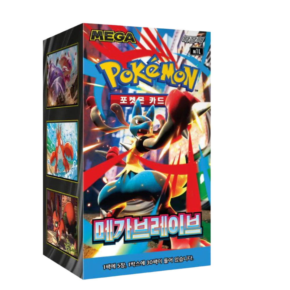 A Pokémon Mega Brave Booster Box – Korean It offers exclusive cards from the expansion, including rare Pokémon, holographic cards, and special illustrations from the line. Mega Brave.