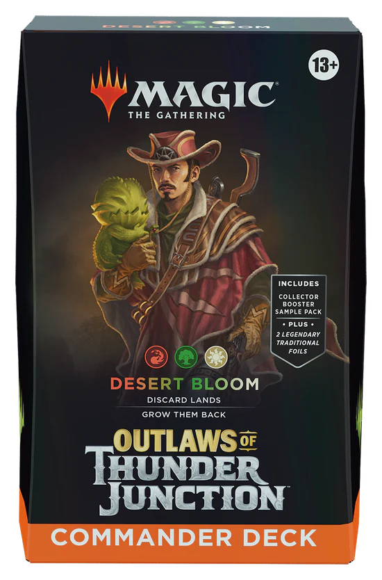 • CONTENTS—1 ready-to-play Desert Bloom Outlaws of Thunder Junction Commander Deck, a 2-card Collector Booster Sample Pack, 10 double-sided tokens, 1 life tracker, and 1 deck box