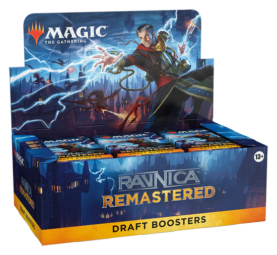 This Ravnica Remastered Draft Booster Box contains 36 Ravnica Remastered Draft Boosters. Each Draft Booster contains 15 cards and 1 token/ad card, including 1–2 cards of rarity Rare or higher, 3–5 Uncommon, and 9–11 Common cards. One card of any rarity is Retro. A Traditional Foil card of any rarity replaces a Common in 33% of boosters. Traditional Foil Borderless Mythic in <1% of boosters.