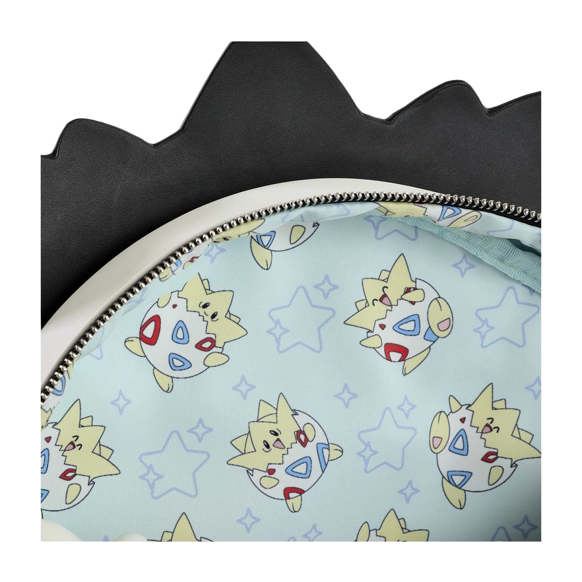 Metallic logo plate and printed fabric lining featuring Togepi